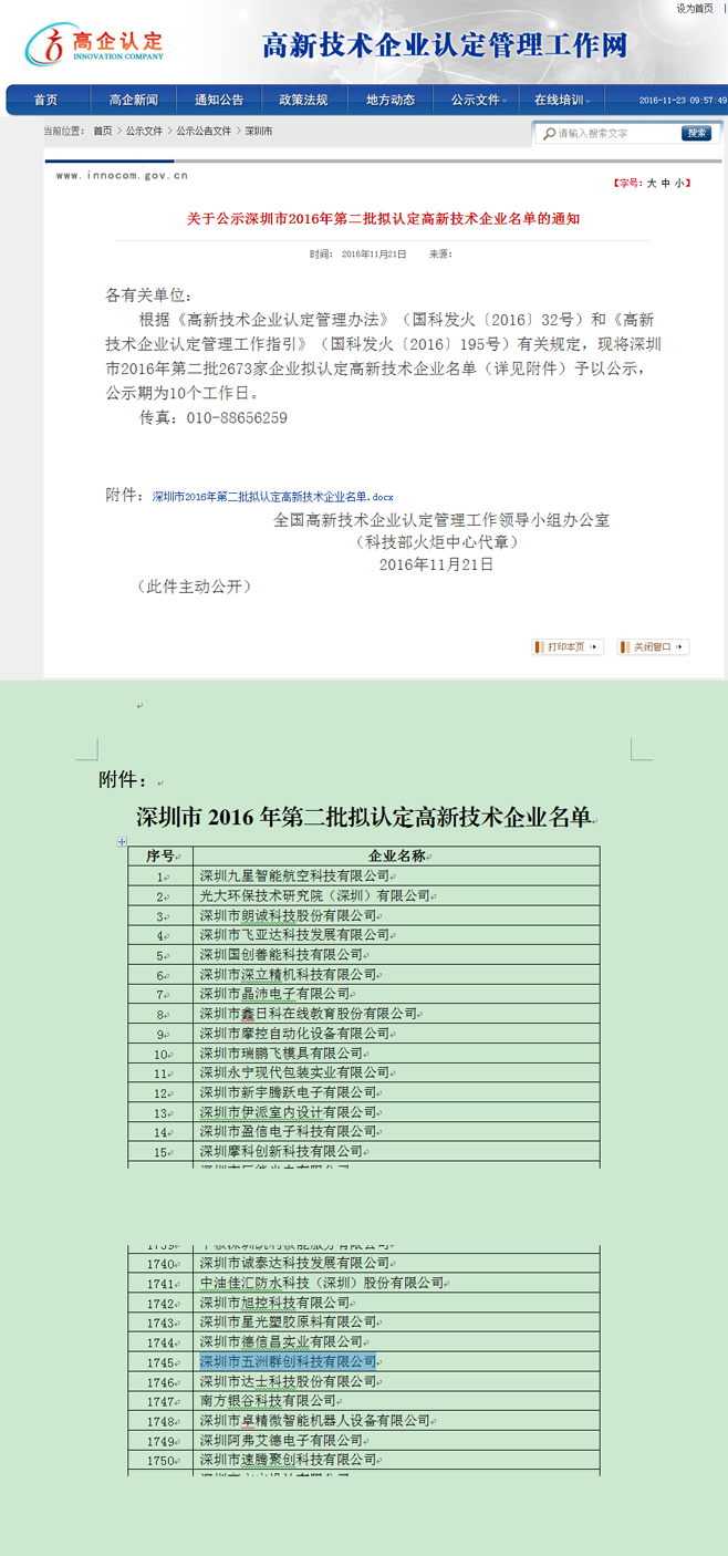 2016年11月21日,高新技術企業認定管理工作網發表了《關于公示深圳市2016年第二批擬認定高新技術企業名單的通知》(以下簡稱《通知》)。在《通知》的附件《深圳市2016年第二批擬認定高新技術企業名單》中,深圳市五洲群創科技有限公司榜上有名。