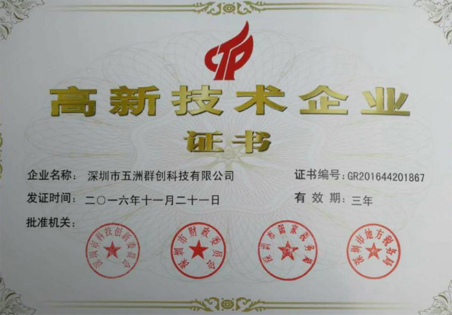 根據國家《高新技術企業認定管理辦法》、《高新技術企業認定管理工作指引》的相關規定,經過嚴格的層層審查,深圳市五洲群創科技有限公司憑借過硬的研發實力和創新能力,榮獲由深圳市科技創新委員會、深圳市財政委員會、深圳市國家稅務局、深圳市地方稅務局聯合頒發的"國家高新技術企業"認定證書,五洲由此正式邁入國家高新技術企業行列。