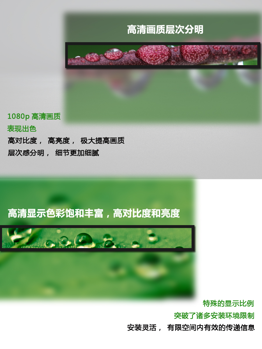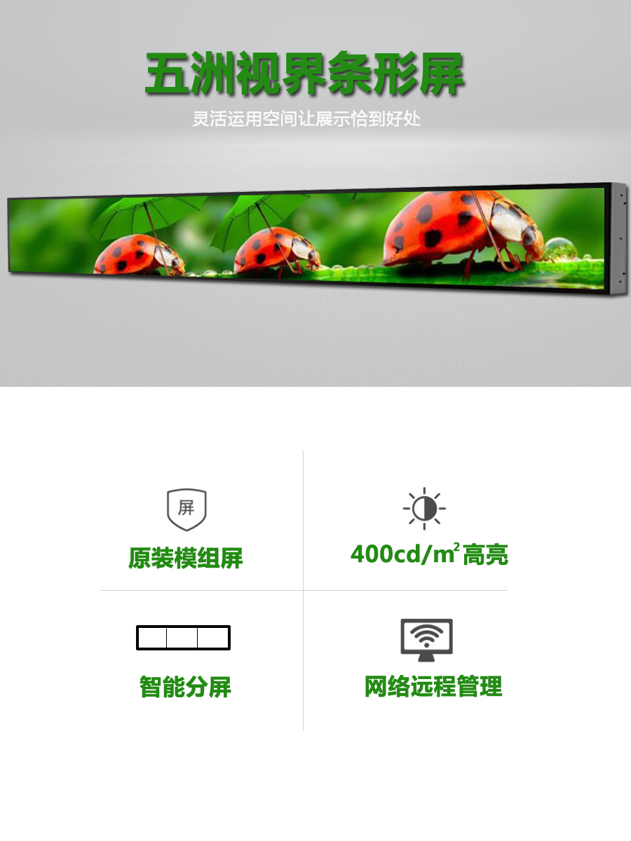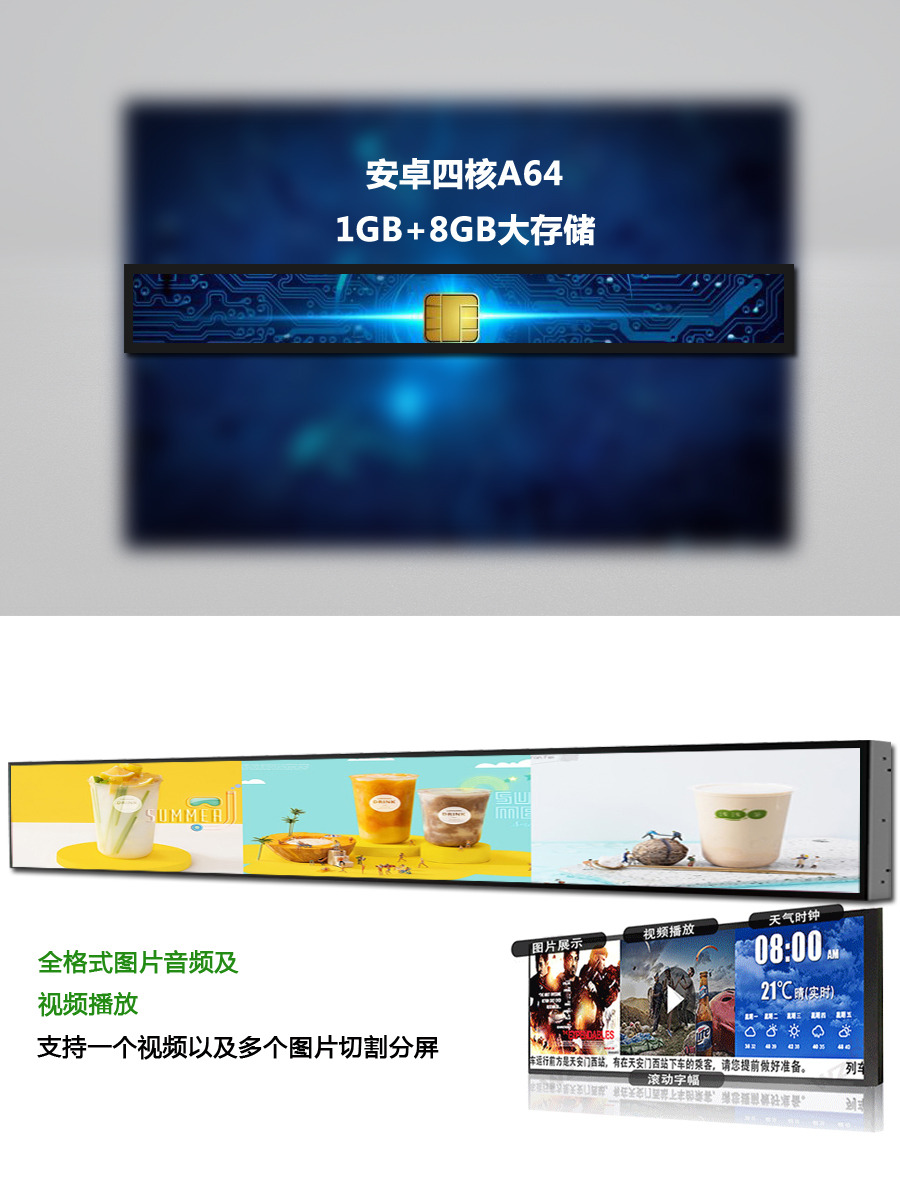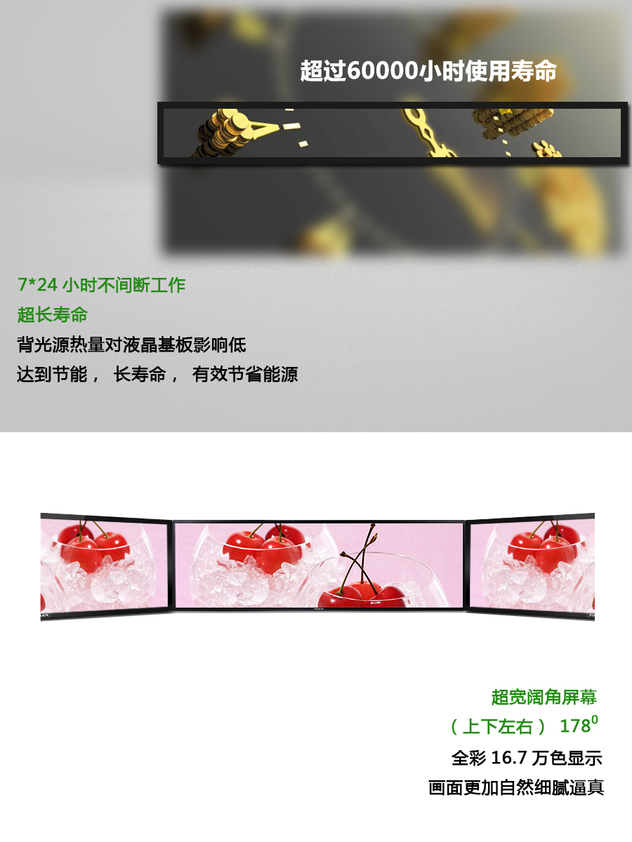 相比傳統的液晶顯示屏,條形液晶屏可以根據貨架的尺寸進行定制,在不占用原來產品展示空間的前提下與貨架完美融合,具備高清晰度、高發光效率、高色彩飽和度等特點,并且可以根據客戶的使用環境提供不同亮度的產品,可以在半戶外環境下使用。