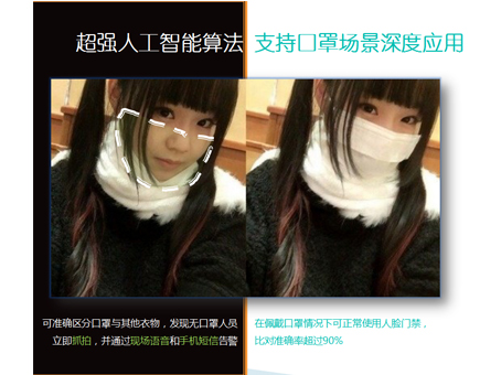 現在因為疫情防控的需要,人們出門都戴著口罩,這對于人臉識別技術來說是一種不小的挑戰。針對這一場景,捷易科技還專門針對這款人臉識別體溫監測一體機升級了支持口罩檢測、安全帽檢測、帽子檢測等多種功能,真正實現了無感精準監測體溫的目的。