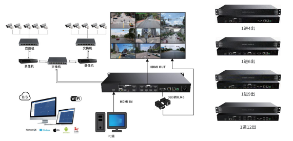 它除了解碼器的全部功能之外,還具有更多的功能和更強的解碼能力。可以支持不同廠商的DVR、DVS、IPC、NVR設備同時解碼上墻,并具有視頻切換、畫面分割、畫面拼接、輪循顯示、云鏡控制、錄像回放、報警聯動等功能,控制畫面能力更強。