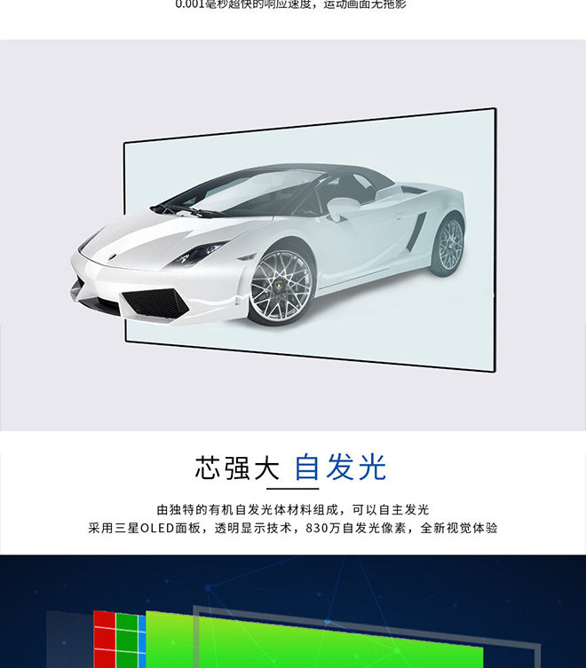 采用原裝進口OLED面板,無背光,屏幕可以自發光,實現更深邃、更鮮明的畫質。