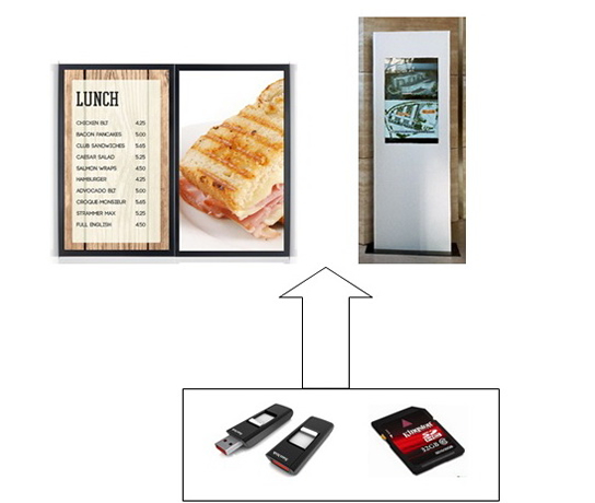 拷貝制作好的節目到U盤, 插入USB接口, 廣告機自動播放節目列表. 可以設置轉場模式等個性化模式. 1.金屬鋁合金殼,表面鋼化.......