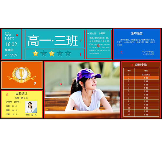 A區域:展示時間、天氣、溫度、網絡情況,信息實時更新的。 B區域:展示集體照片、個人板報等、調查問卷、趣味知識等,可輪換播放, 播放規則易學易用。 C區域:展示學校的通知通告(手動下發)或課程調整(自動下發)等信息。 D區域:展示優秀班級、優秀標兵等。 E區域:展示上課出勤數據,及當時課節的時間、教師信息。 F區域:班級名稱。 G區域:展示班級班主任照片及相關信息。 H區域:展示當日課程安排。