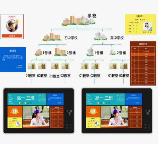 智慧校園班牌顯示方案是以班級信息展示為主體,通過智慧班牌設備和后臺統一管理,將實現班牌展示、考勤狀況匯總展示、課表展示、優秀標兵展示、校園通知展示、班級文化圖片展示等多種功能。 智慧班牌管理系統有助于解決學生缺席選修課程這一問題,是學校校園安全工作的重要項目,是“走班制”實行后學校急需的教育教學工具;通過色彩鮮艷、友好的人機交互界面向學生傳達校園文化、集體榮譽、個人風采,將豐富的、健康的、陽光的課余氛圍層層遞進,深入人心,對學校德育工作、減負工作均起到積極有效的作用。