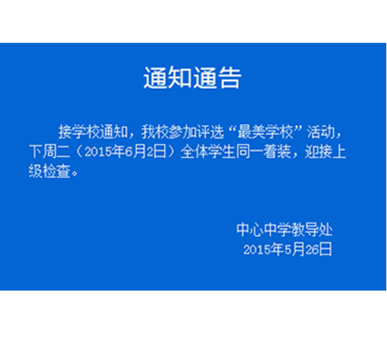 學校可通過后臺發布校方通知公告,如果產生調課信息,系統自動在相關設備上發布通知公告。 該功能可實現學校各種活動及政策的下傳下達,保證各項通知及時到位。